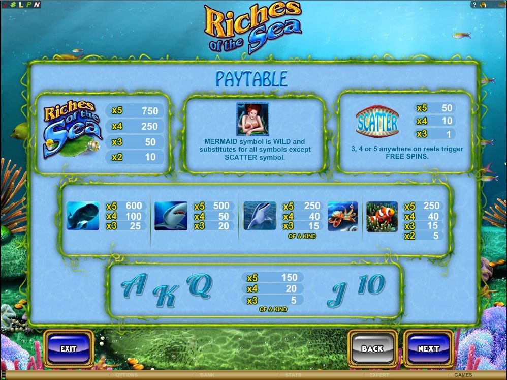 Symbols: Mermaid (wild), Scatter Logo (50x total bet, scatter), Riches of the Sea Logo (750x), Whale (600x), Shark (500x), Dolphin (250x), Octopus (250x), Fish (250x), Ace (150x), King (150x), Queen (150x), Jack (150x) and 10 (150x).