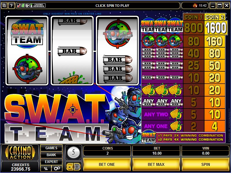 This S.W.A.T. Team slot is offered by all online casinos with Microgaming software, playable either in practice or in real money mode.