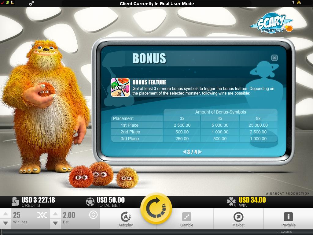 The third and final symbol that is important here has an image of four different monsters on it, and it’s marked Bonus. This symbol is needed in at least three locations, before it can grant you access to the bonus game. There is a competition of sorts between the monsters, and depending on the place occupied by the one you picked, and based on the number of triggering symbols, the rewards will vary.