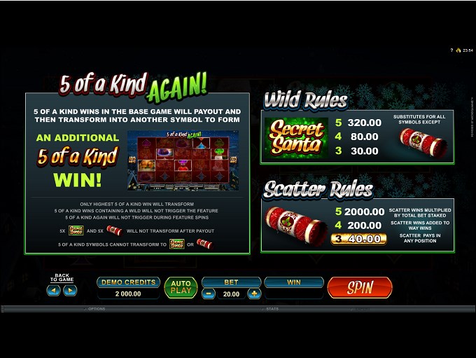 Though it has a good design, the features are the ones that are truly strong in Secret Santa. I’m talking about the huge number of ways to win, about the wild symbol, scatters, the “5 of a Kind Again” feature or the 7 different mystery features which trigger at random. Overall, there is a wealth of features in this game that you rarely see even in modern slots.
