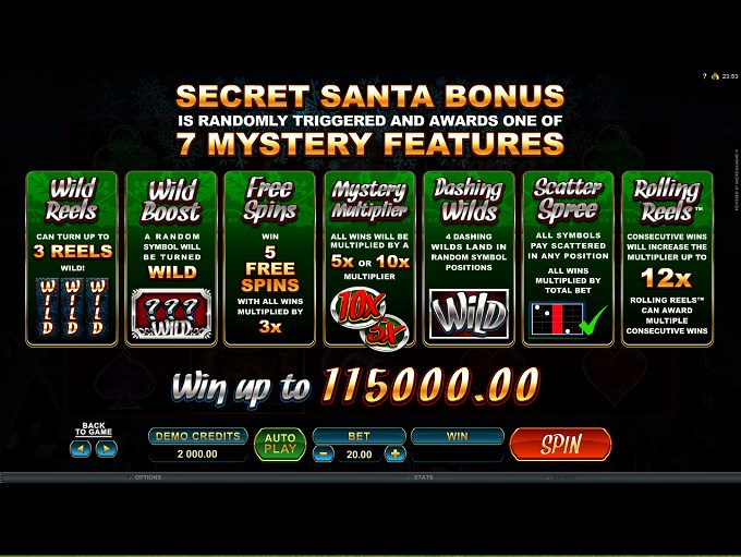 The bonus game offered by Secret Santa is triggered at random, so you can’t do anything to get it started. Once it starts, it will give you access to one of the 7 mystery features.