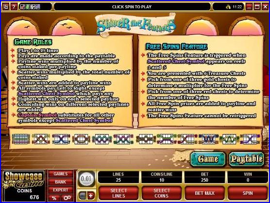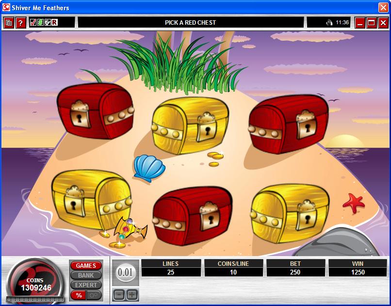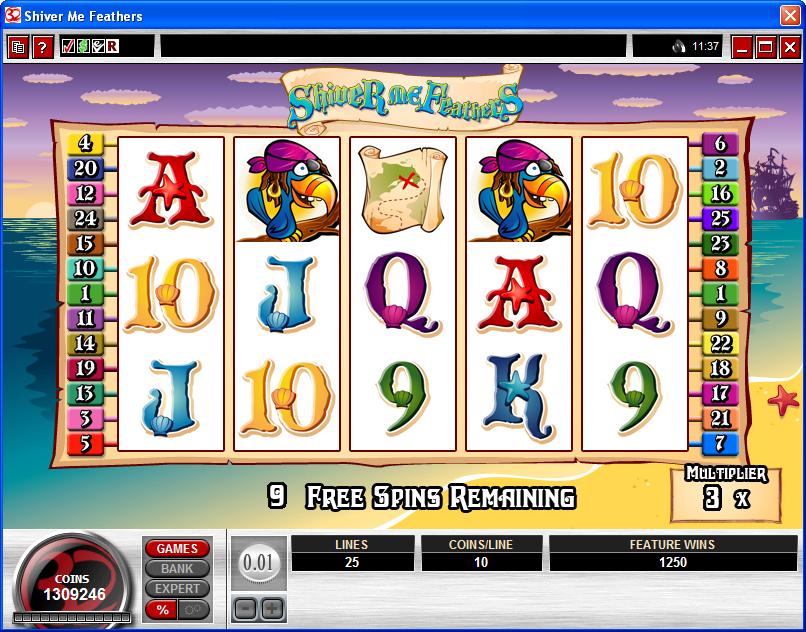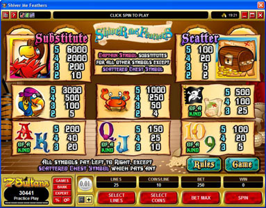5 reels are available in Shiver Me Feathers, a total of 25 paylines being used on them. Microgaming gives you free games and multipliers through a bonus game that you have to trigger, using scatter symbols for this purpose, but also having wilds along the way. The jackpot is worth $30,000.