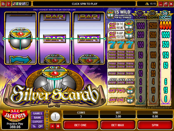 This Silver Scarab slot is offered by all online casinos with Microgaming software, playable either in practice or in real money mode.