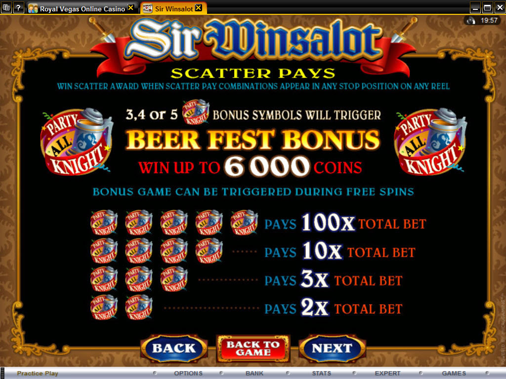 Sir Winsalot has 5 reels and on them you will get a maximum of 20 bet lines. Top payouts will stop at $1,250, but you will find among the features a beer themed bonus game, free spins, scatters and wilds.