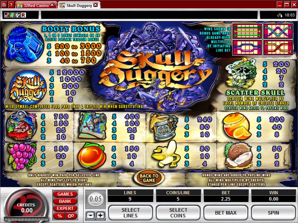 9 win lines are used in Skull Duggery, a 5 reel pirate themed game. Scatter symbols, the Booty Bonus game and a wild with multipliers make up the list of features. Top payouts reach values of $60,000.
