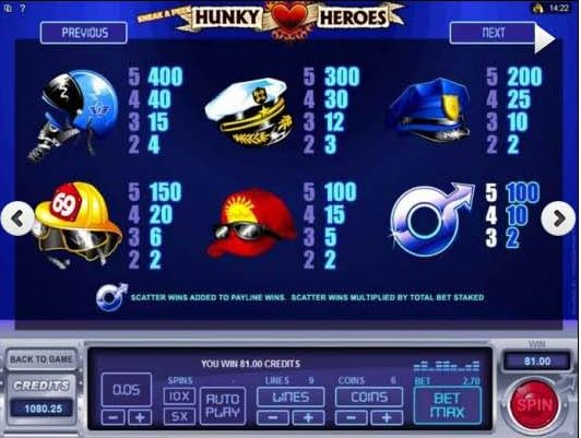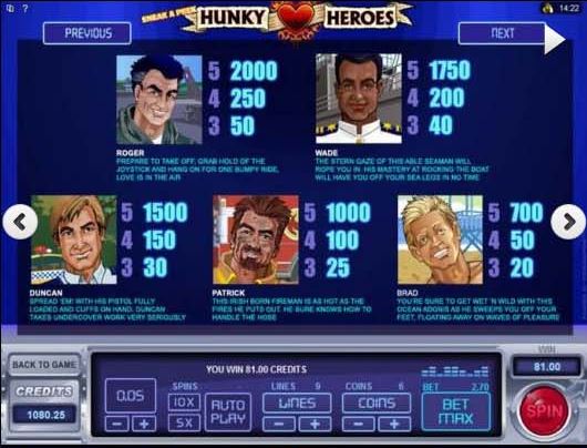 Hunky-HeroesHunky Heroes has a theme that I haven’t seen approached before, being designed with a focus on all kinds of uniformed heroes, from firemen, to air force pilots, lifeguards, policemen or navy guys. It seems like a great game for a lady that wants to have something nice to watch while the reels are spinning, something that the guys have had in plenty of titles before. Microgaming is the designer behind this game, which is quite different from the others that you might’ve found in the past.
