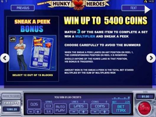 This bonus game will put up to 5,400 coins in your account, but first you have to trigger the feature. You need a single Sneak a Peek symbol to land on the 1st reel, in any position, and that will mark the same position from the 5th reel. If a Hunk symbol lands in that position, you get the bonus game. It seems a bit too elaborate to get it started, but there are five different symbols with Hunks that can help you out, so it shouldn’t be too difficult to trigger.