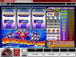 Spectacular is a classic slot machine, with a theme which shows off the kind of show that you would see in Las Vegas. With exotic dancers showing off their dancing skills in the background, the game area is a combination of both exotic and classic images. Add a rather interesting bonus feature, where you get the Wheel of Wealth, and you will find that it’s a much better game than most classic slots manage to be.