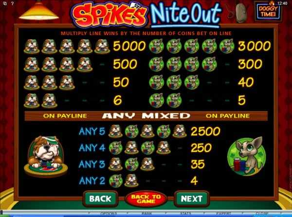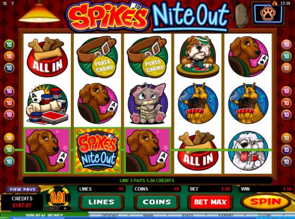 Spike’s Nite Out is a Microgaming slot machine, where the theme gives you a picture of a night full of fun, the protagonists being a bulldog named Spike and all his dog friends. You see them playing cards for the most part, so it seems that they went out to a casino. It’s well enough handled, above average for Microgaming and for the slot industry in general, especially when it comes to the graphics which are used.