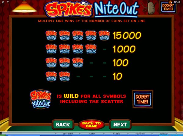 To start with, let’s take a look at the wild symbol, whose image is that of the Spike’s Nite Out Logo. This wild symbol can replace any other icon, as long as it’s a regular one, which doesn’t have scatter abilities. Landing in the right spot on a payline will allow it to take the role of another symbol, but only if the rest of the symbols needed for a combo are already in place. The wild is also capable of forming its own combinations, whenever it lands with two to five symbols, from left to right. It can award top payouts of up to 15,000x, the biggest that this game has to offer.