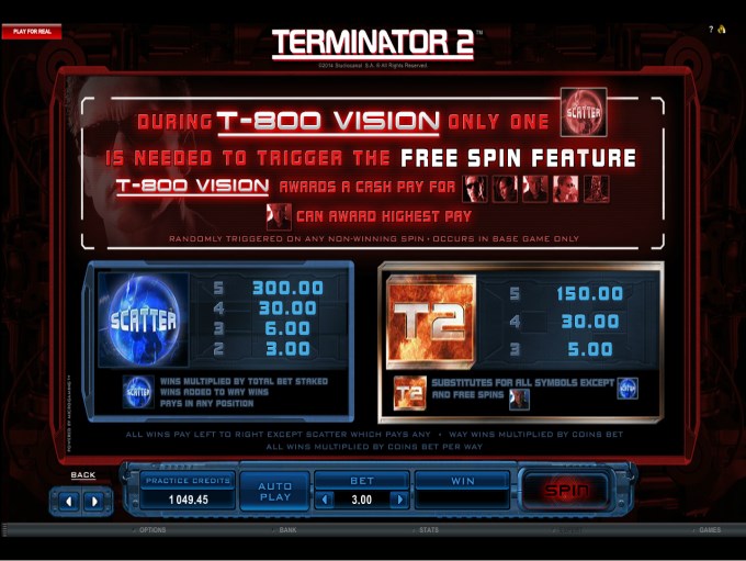 The Terminator 2 – Judgement Day slot machine is offered through the Microgaming platform, so if you want to play it for real or just to practice, look out for casinos that use it.