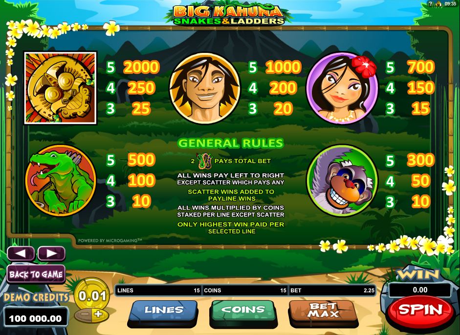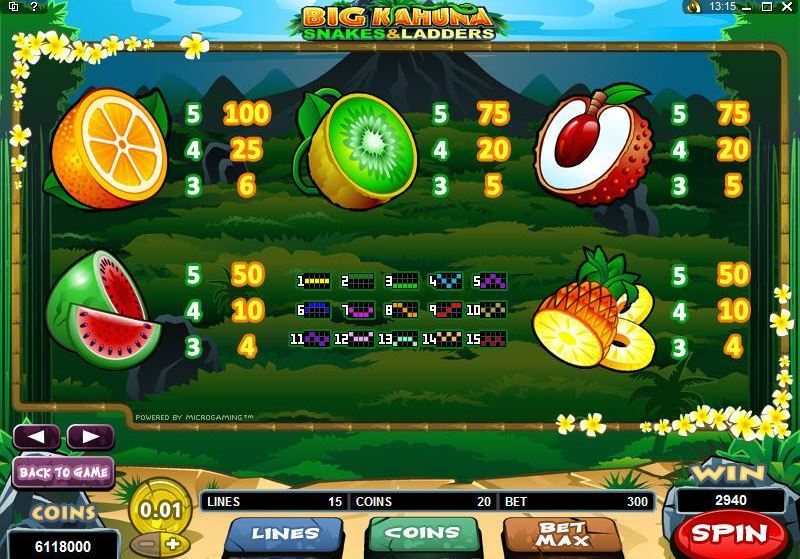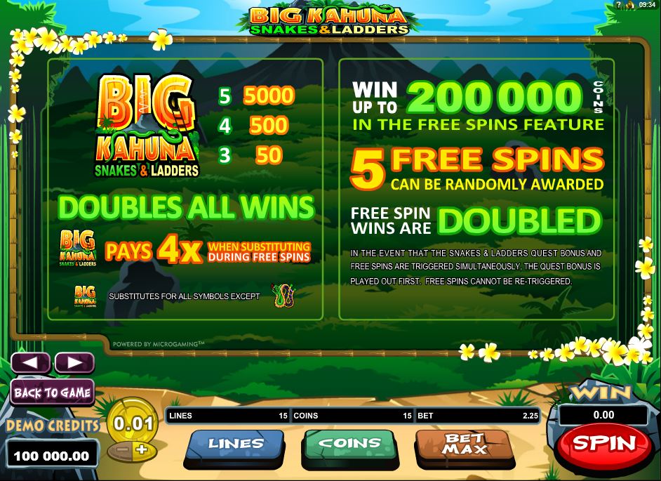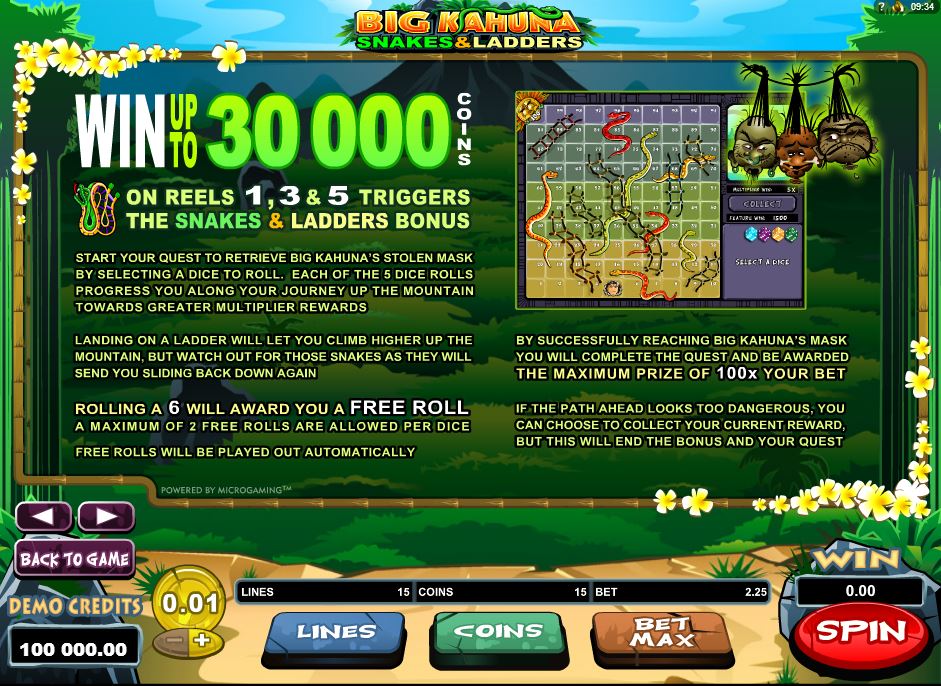 The The Big Kahuna Snakes and Ladders slot machine is offered through the Microgaming platform, so if you want to play it for real or just to practice, look out for casinos that use it.
