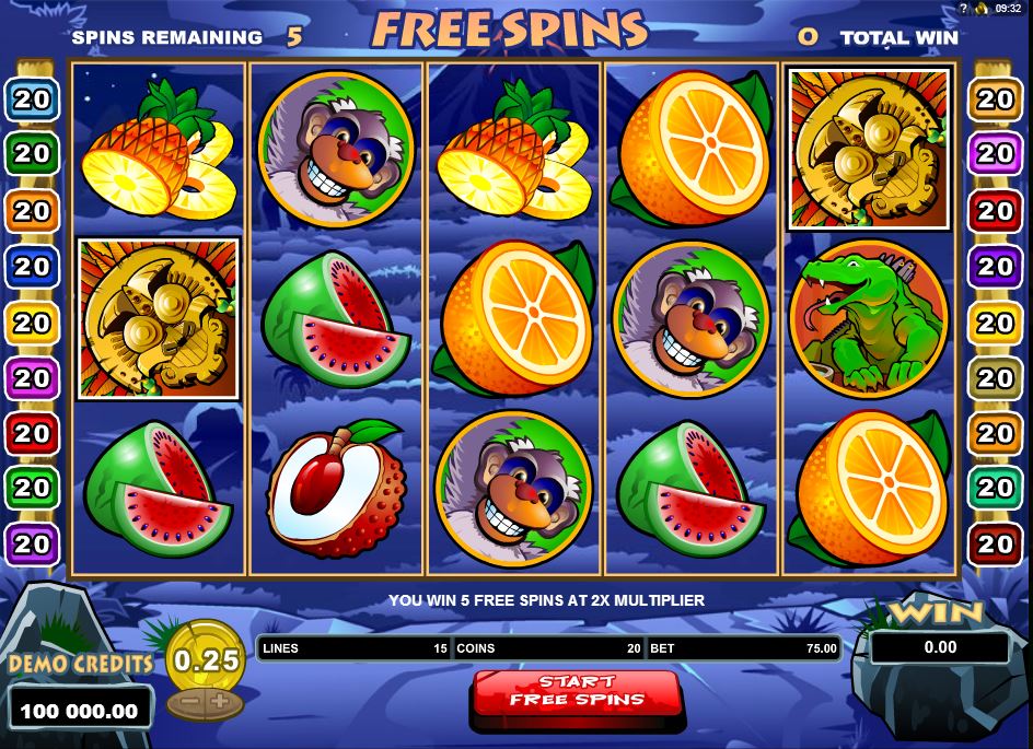 The symbols all look jungle themed, and that’s the case for both the fruits and the tribe members and animals that are part of the paytable. There are no playing cards here, which is a good thing. The design is colorful and clean, simple enough without becoming boring. It’s not the best design you will ever see, not even close, but you’re going to have no problem spending some quality time on it.