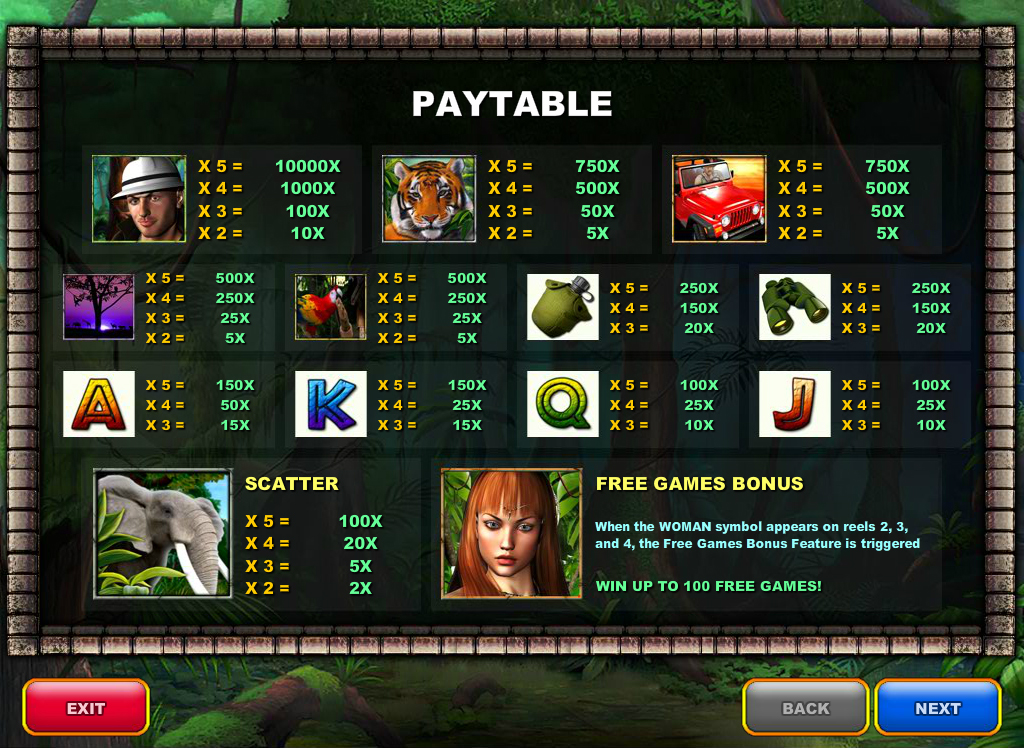Symbols: Elephant (scatter, 100x bet), Woman (scatter), Explorer (10,000 coins), Tiger (750 coins), Jeep (750 coins), Tree (500 coins), Parrot (500 coins), Water Canteen (250 coins), Binoculars (250 coins), Ace (150 coins), King (150 coins), Queen (100 coins) and Jack (100 coins).