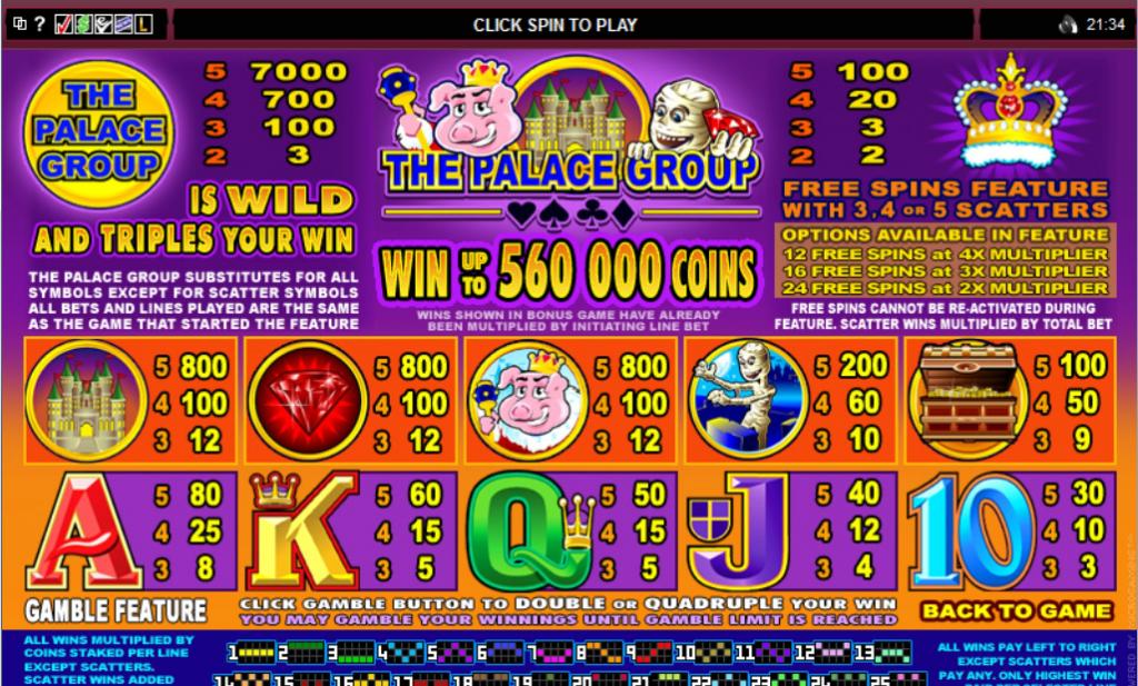 Symbols: The Palace Group Logo (wild, 7,000 coins), Pig’s Crown (scatter, 100x total bet), Palace (800 coins), Red Diamond (800 coins), Pig King (800 coins), Mummy (200 coins), Treasure Chest (100 coins), Ace (80 coins), King (60 coins), Queen (50 coins), Jack (40 coins) and 10 (30 coins).