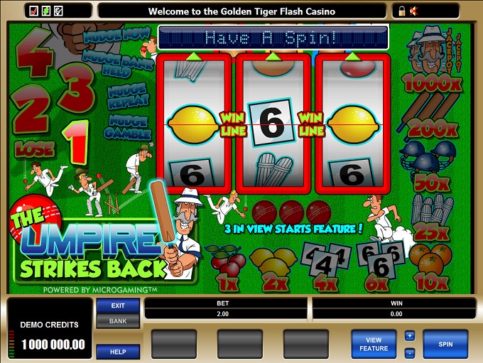 While it doesn’t come close to being as good looking as a modern game can be, The Umpire Strikes Back does have more to offer than any classic 3 reel slot machine ever did. The paytable surrounds the reels on the right, while on the left you see a couple of players playing cricket, along with the nudge options. The characters are more on the funny side than the impressive, but they work well for this game.