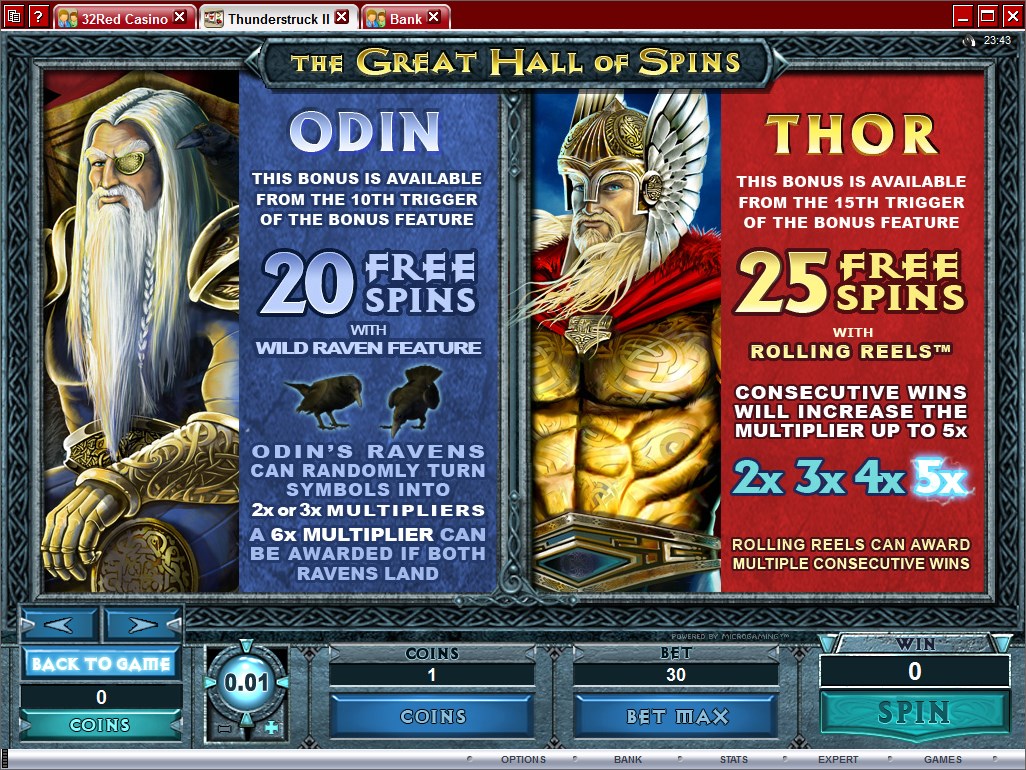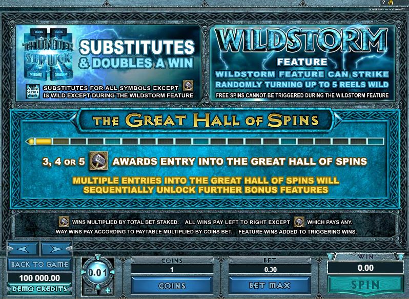 Among the features offered in Thunderstruck II, which are much better than in the first title, you will find the ways to win, the wilds which apply multipliers, the Wildstorm feature and the Great Hall of Spins, with its four types of free spins.