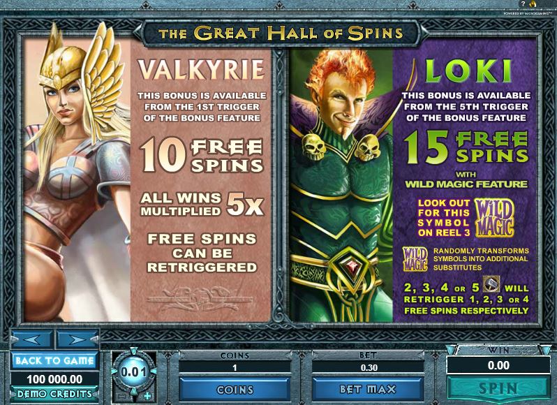 Loki is next, available when you have at least five rounds of free spins triggered. 15 free spins are available and they come with the Wild Magic feature. This feature brings you a wild symbol on the 3rd reel, which will turn other symbols at random, into additional wilds. You can retrigger between 1 and 4 free spins, with 2 to 5 scatters.