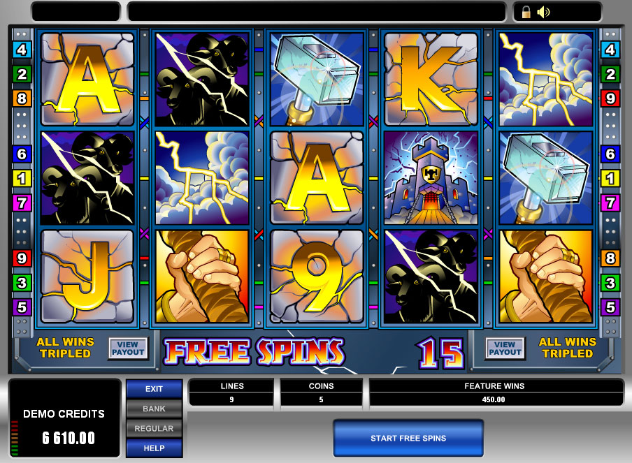 The free spins offered in Thunderstruck are triggered with 3 or more Ram scatters present on the 5 reels. Your reward will be 15 free spins and tripled prizes for the duration of the feature. Activating the free spins again is possible, as long as you have another 3+ Rams present in one of the rounds.