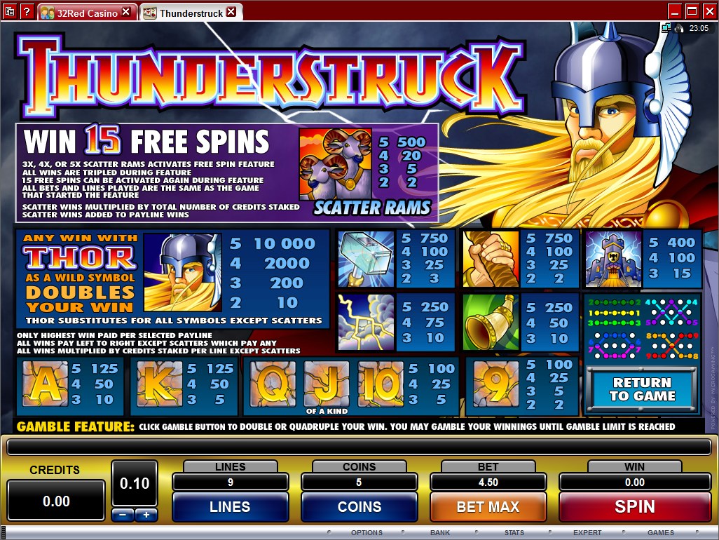 The Thunderstruck slot machine is offered through the Microgaming platform, so if you want to play it for real or just to practice, look out for casinos that use it.