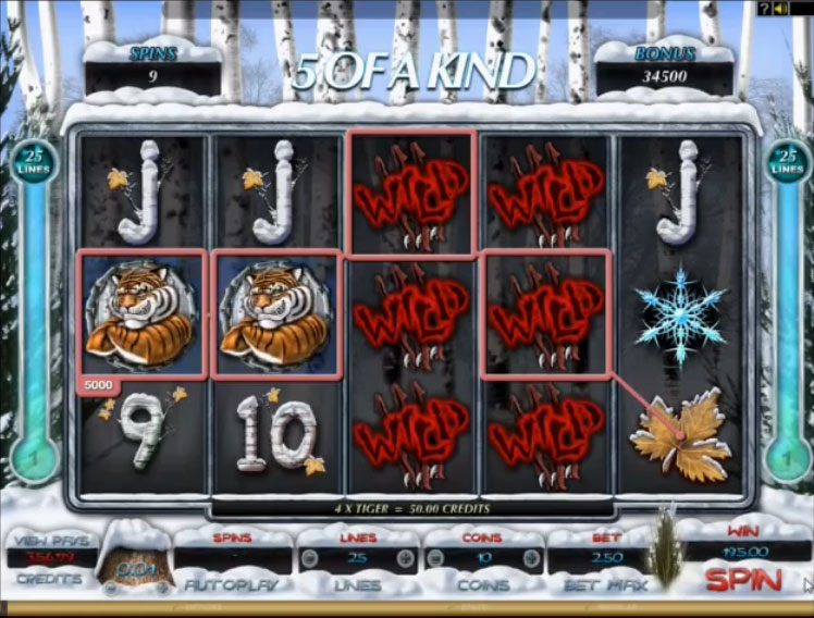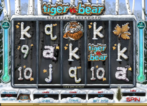 The battle between the bear and the tiger takes place in a Siberian forest, visible behind the game area with its white trees and snow covered ground. The symbols are made out of the same white trees when the playing cards are concerned, while the rest are images of the two protagonists, of leaves, snowflakes and so on. It’s a decent looking game, but not one to knock your socks off with its quality.