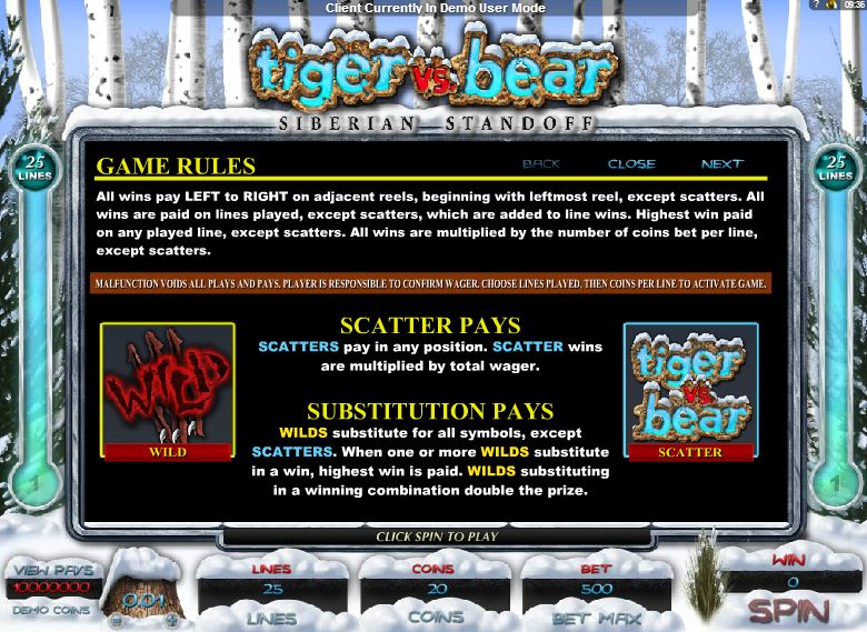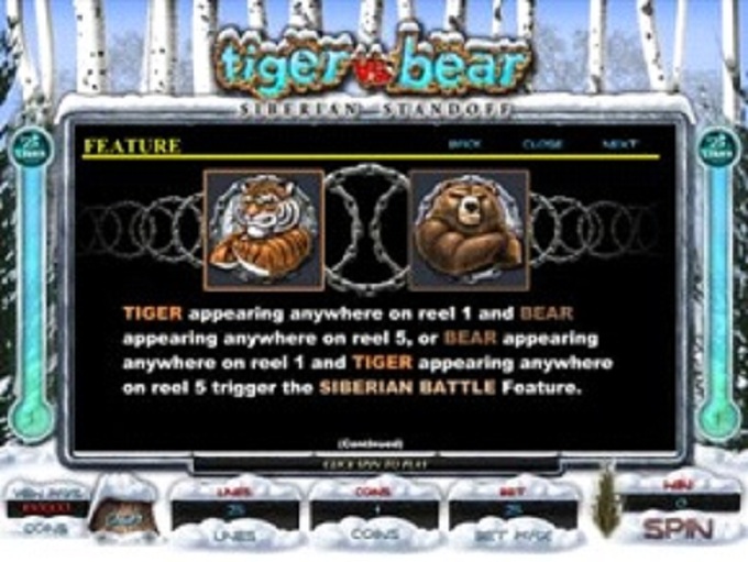 On the 5 reels of Tiger vs Bear there are 25 paylines which are waiting to be activated each round. They will come filled with symbols that include among them scatters and wilds, triggering bonus games and free spins. The biggest reward offered is $6,000.