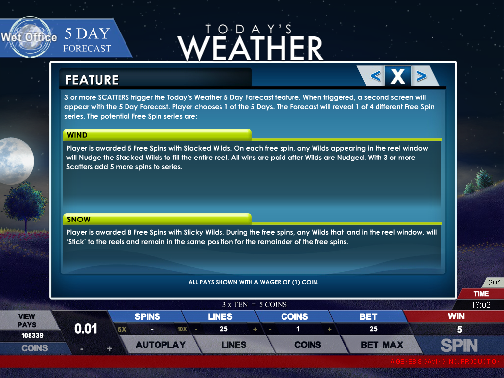 If you happen to trigger the 5 Day Forecast Feature, it means that you had 3+ scatter symbols present during that round. A new screen loads up if this happens, and a 5 Day Forecast space appears, where you pick one of those 5 days and you get from the slot one of four types of free spins.