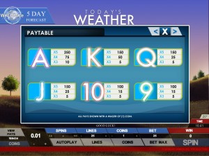 The action in Todays Weather relies on scatter symbols, on wilds, bonus games and free spins, to make sure that the result is as good as the choice of theme.