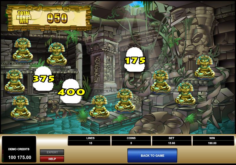 The next screen loads up a temple with 12 idols inside. You pick 3 to 5 idols (for 3 to 5 triggering symbols) and you get paid between 12x and 500x by each one. The most you can take home is 2,500x the line bet.