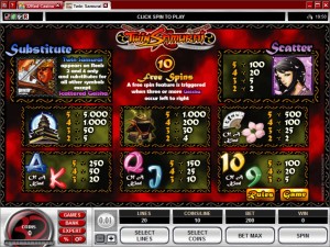 The Geisha, a very common choice for a symbol in Asian inspired slots, will act as the scatter feature of Twin Samurai. Since it’s the scatter, it will appear anywhere on the reels and will offer prizes based on the number of appearing symbols and on the bet used that round. There is also the requirement that scatters appear from left to right, so they can be anywhere on the reels, but the reels have to be neighbors. Prizes for two to five Geishas vary between 2x and 100x the round’s bet.