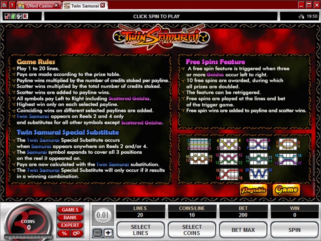 You can expect to count up to 20 paylines that are active each round in this 5 reel game. Twin Samurai offers you access to scatter symbols, to expanding wilds and free spins with 2x multipliers. A $25,000 top jackpot is advertised on the paytable.