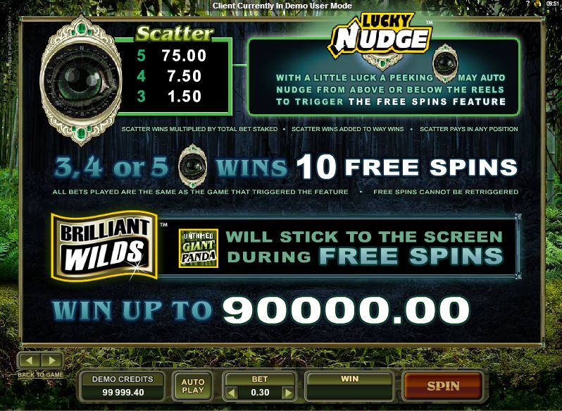 Giant Panda’s set of 5 reels come with 243 paylines/ways to win on them. They also have the other features of the Untamed series, like the wilds and the wild reels, the free spins and the scatters which can benefit from lucky nudges. A $5,625 top prize is offered.