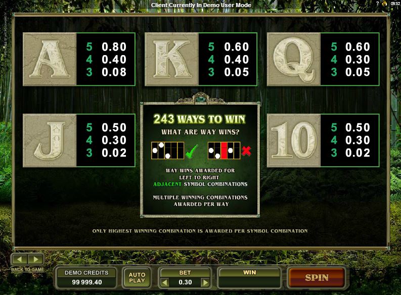 Your wagers will be on 30 lines at all times, the game considering this amount sufficient to cover 243 ways to win. Each line gets up to 15 coins and their value will only go from $0.01 to $0.05, allowing for line bets of $0.75 or lower. For 30 lines, it’s a maximum bet of $22.50.