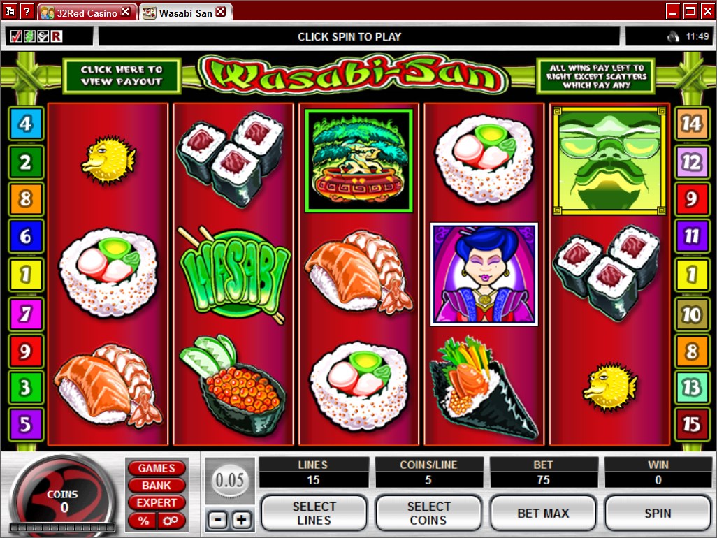 Wasabi – San is inspired by the strong condiment that is used in sushi dishes, called Wasabi. It’s not the only focus of the game though, with symbols including things like Bonsai Trees, Japanese cooks, geishas and puffer fish. It’s more of a Japanese inspired game, with a lot of food related elements included. It’s one of the games developed by Microgaming. The wasabi angle hasn’t been tried before, but sushi has gotten its share of slot machines.