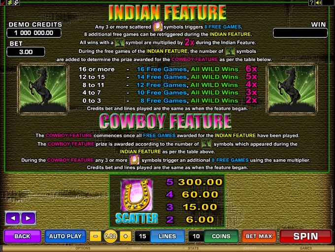 0 to 3 wilds will bring you the Cowboy feature with 8 free spins and wild multipliers of 2x. 4 to 7 wilds during the Indian feature will trigger 10 free spins and 3x multipliers for the wilds. 8 to 11 gathered wilds will offer 12 free spins and 4x multipliers for wild assisted wins. For 12 to 15 wild Horses, the game offers 14 free spins and 5x multipliers when the wilds get involved. Finally, for 16 or more wilds obtained during the Indian feature, you get 6x wild multipliers and 16 free spins.