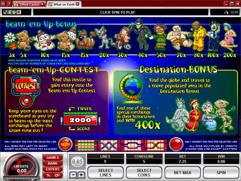 The game asks you to beam up as many types of earthlings as possible, in a limited amount of time. You will see the score go up with each new earthling that you beam aboard. The payouts vary between 3x and 200x the line bet, depending on the type of earthling.