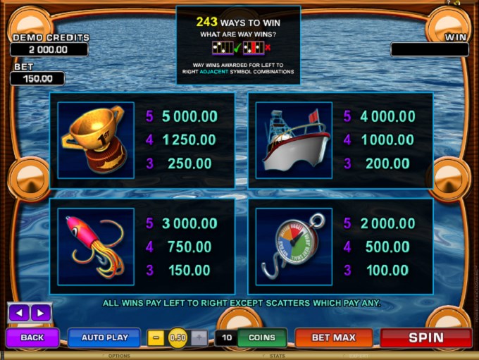 The wild symbol shows a very happy Swordfish. This symbol is going to substitute for all the symbols, with the exception of the scattered Fisherman. You will only get it on the 2nd, 3rd and 4th reels. This symbol is responsible for triggering the Wild Feature.