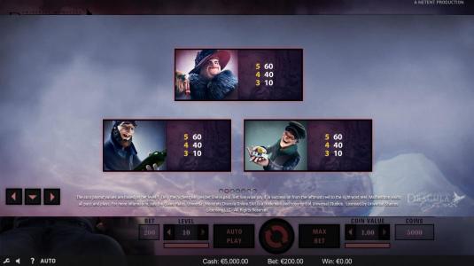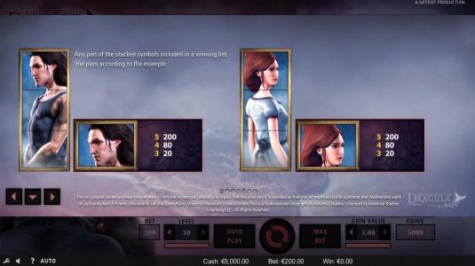 Symbols: W Logo (wild), Dracula (200x), Lady (200x), Rich Woman (60x), Man with bottle (60x), Boy (60x), Ace (40x), King (40x), Queen (40x) and a Jack (40x).