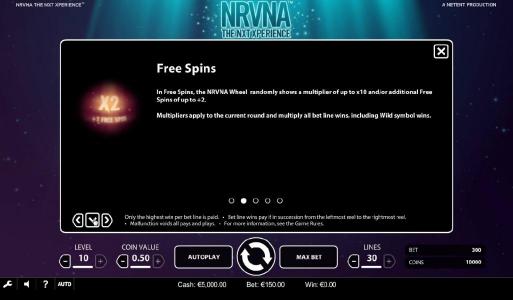 A NRVNA Wheel can be present during the free spins, and if it does trigger you can get up to 2 extra free spins, or multipliers that go as high as 10x. Only that particular round gets the benefit of the multiplier if it’s triggered.
