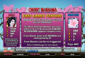 The slot will give you a number of free spins as well, whenever 3 or more scattered Cherry Blossoms are on the reels. Three of them will bring you 15 spins, four will trigger 20 spins and the maximum of 25 free spins will come from five scatters.