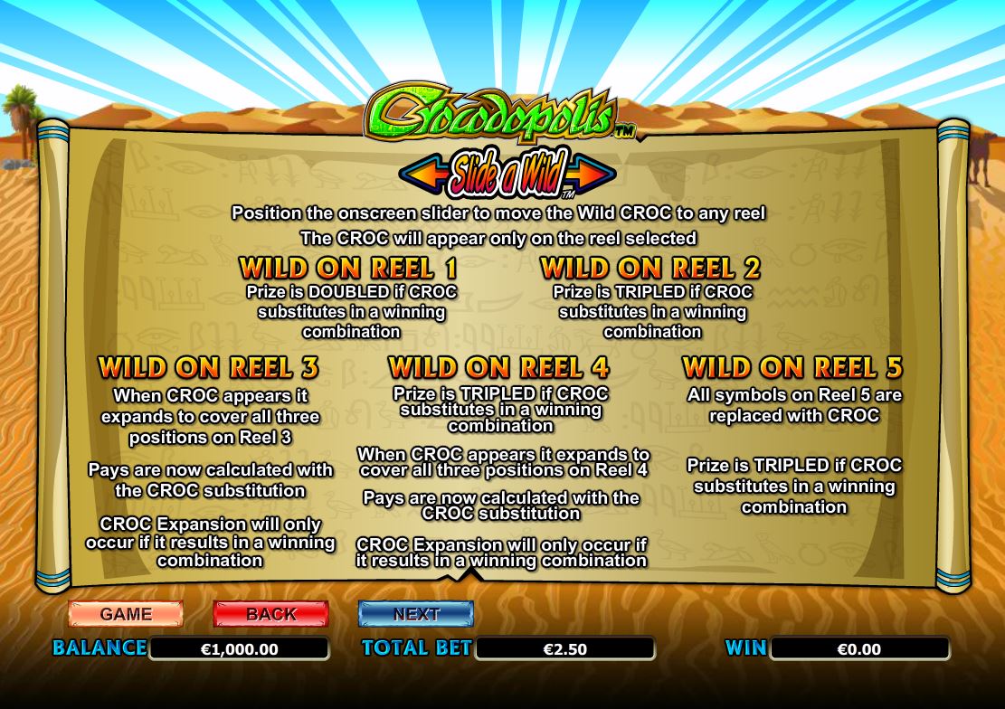 The feature called Slide a Wild isn’t just available in Crocodopolis, as NextGen has included it in a couple of other titles of theirs. It basically allows you to choose on which reel the Croc wild can show up, and depending on the choice there will be a certain multiplier attached to it. You use the slider found at the top of the reels to move the position of the wild symbol.