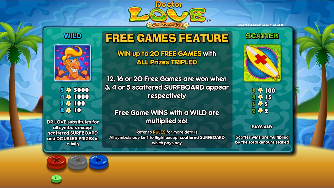 Once again, we have Doctor Love as the wild symbol in this game. However, he’s not wearing that doctor’s robe anymore and he seems ready to surf. As a wild, it can be part of any other combo if it lands in a position that allows it to substitute for another symbol. It also doubles payouts whenever it contributes to the formation of a new combination. The Surfboard scatter is the only one which can’t be replaced with a wild. Get multiple wild symbols together, on a line, and you will win up to 5,000x. This prize goes to 15,000x if it’s won during free spins.