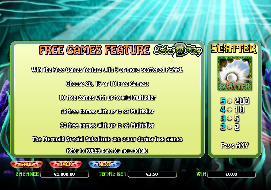 Find 3+ scattered Pearls on your reels, and you will be offered a choice, between three types of free spins. Each one has its own multiplier. The first option would give you 10 spins with a 10x multiplier, the second one would bring 15 spins but with a 7x multiplier, and the third option has 20 free spins and multipliers of 4x.