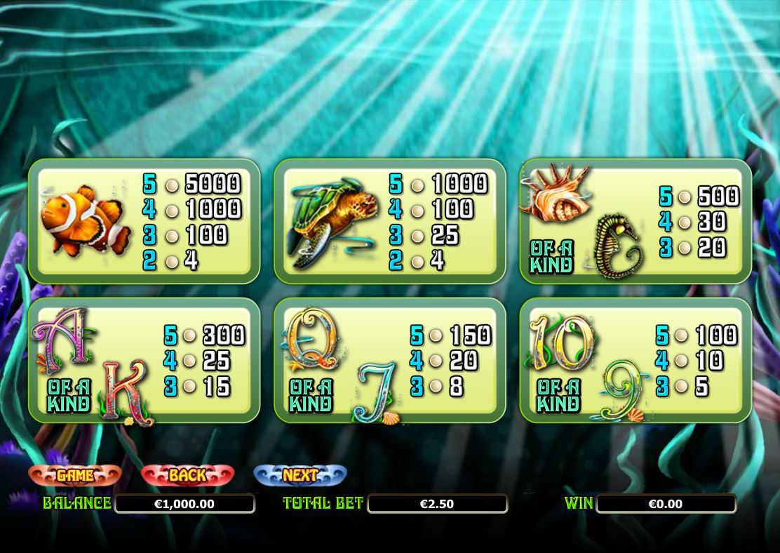 The game’s design is quite wonderful, being themed around ocean life and doing a great job with each individual symbol. The reels are encased in a frame which seems to be made out of metal or wood, and encrusted with shells. All the symbols which appear here look like they’re hanging in mid air, thanks to the transparent reels, and they’re all themed, even the poker cards.