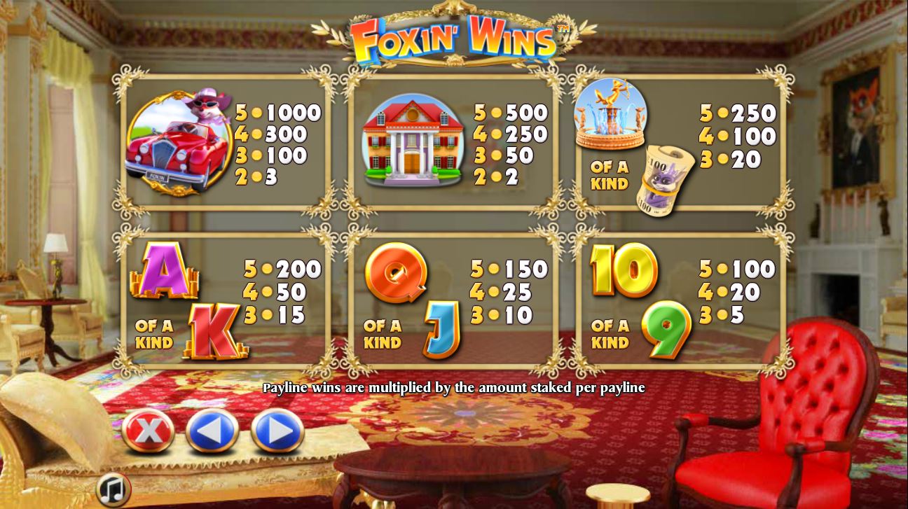 Symbols: Fox (wild, 2,000 coins), Pot of Gold (100 times bet, scatter), Luxury Car (1,000 coins), Mansion (500 coins), Fox Statue (250 coins), Money (250 coins), Ace (200 coins), King (200 coins), Queen (150 coins), Jack (150 coins), 10 (100 coins) and 9 (100 coins).