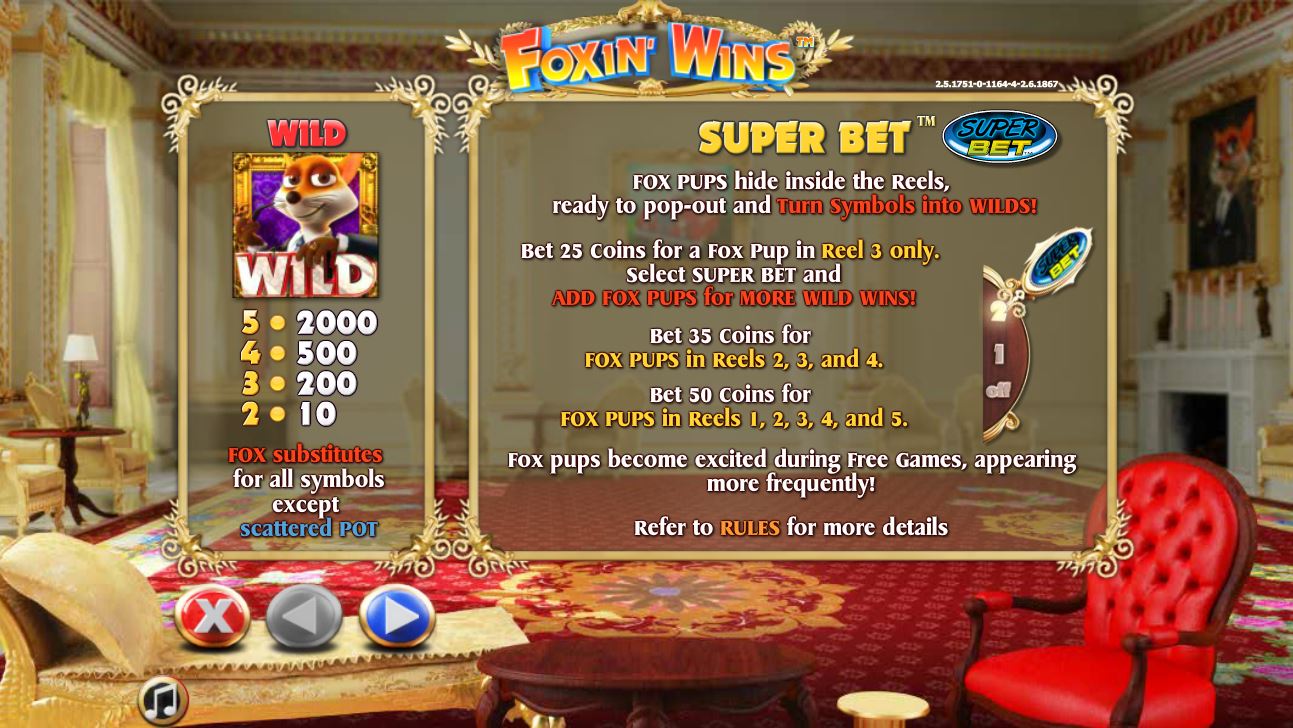 The Super Bet option is activated from the button placed on the right side of the reels. You are taken from Off, to Level 1, and then to Level 2, but you pay extra at each step of the way. You basically pay to get additional Fox Pups to help you out. Whenever these pups appear, they will turn random symbols into wilds, so they can be of great help.