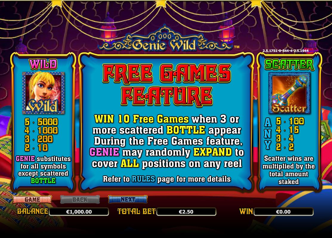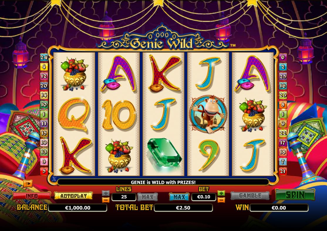 5 reels spin each round in Genie Wild, and on them wins can be arranged on any of the 25 available paylines. Wilds, scatter icons and free spins with expanding wilds are offered as features. A $10,000 jackpot is also advertised.