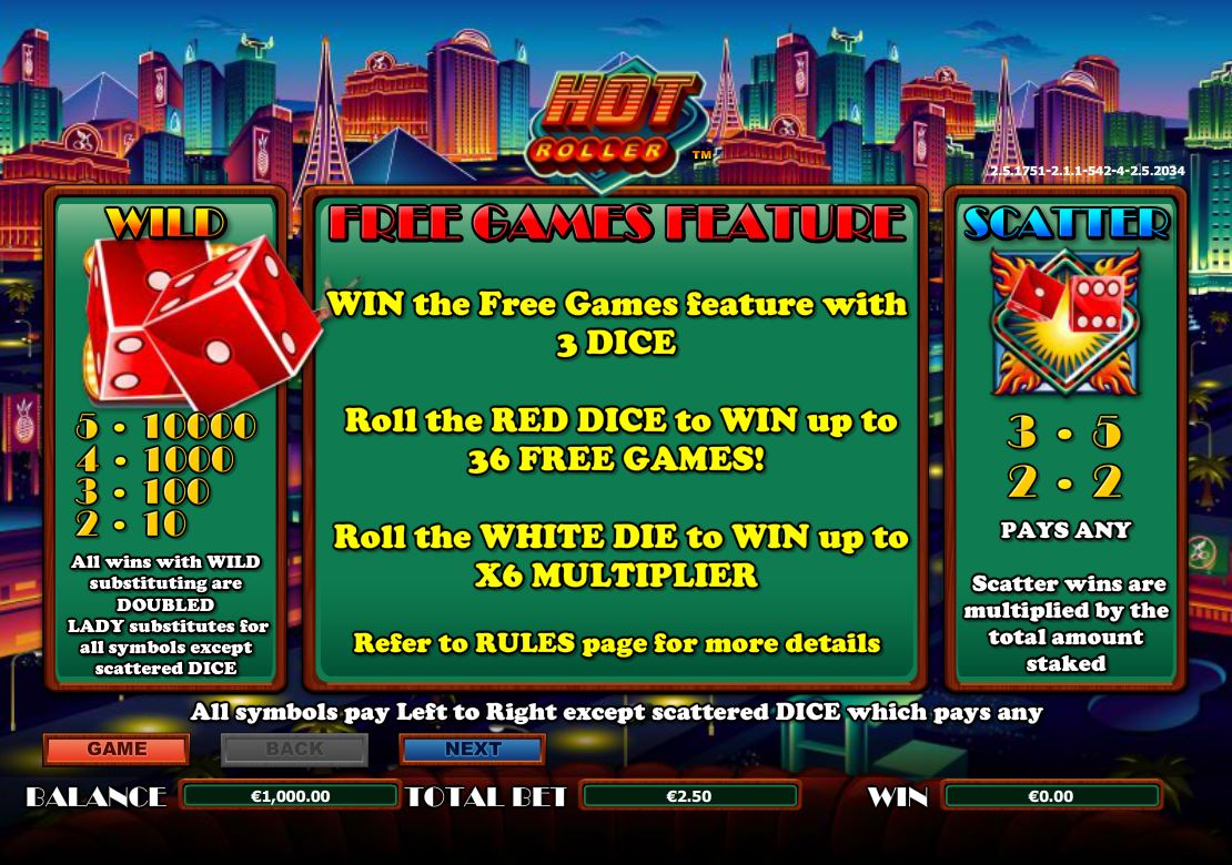 The Hot Roller free spins are somewhat different in the way they are obtained, compared with those from other slots. You basically have to roll the dice to find out how many free spins you’ve gotten, or what multiplier. First though, you need the three Dice scatters on the reels, at the same time.