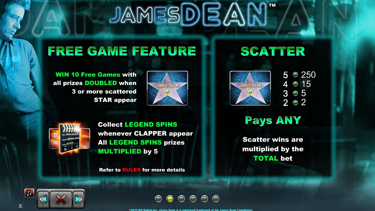 James Dean is seen in the wild symbol, the one that has a blue background behind the actor. The wild icon is present on the 2nd, 3rd and 4th reels and from there it can substitute for any regular icon, excepting the special feature icons, the scatters (there are three of them). You don’t get paid directly by the wild, not being present on enough reels to be able to form a combo.