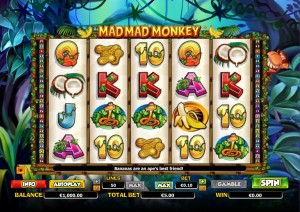 The logo of the game is visible in the other major symbol of Mad Mad Monkey. It’s a scatter symbol, which will pay you from 2x to 400x the bet value when you have enough of them on the reels, plus it will trigger the free spins. The advantage of the scatter is that these symbols don’t need to be on fixed paylines, they can be in totally random locations and still they will award their prizes.